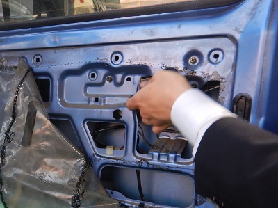 日曜で主治医の店は休業だし閉じ込められていては何もできないだろうというBLUEらすかるの裏をかいて、自販へ持ち込み工場長の手を借りてドアの内張をはがし、集中ドアロックの機能をオミットしてもらいました。