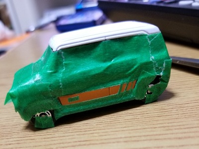 マスキングされていない部分を黒塗りするわけですが、車体サイドのストライプが難しいだろうと思っていたら、ストライプの中の斜めスリットばかりか「HUSTLER」のロゴ部分もオレンジのまま貫くようになっています。