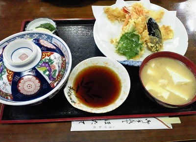 高校生の頃から通っている蕎麦屋に行こうか、もう一軒の天ぷら屋に行こうか思案の末、道路を渡る際に偶数で行けたら蕎麦屋、奇数だったら天ぷら屋と決めて歩いた結果、「吾妻庵」ではなく「ほたて」の暖簾をくぐることに。脳内では天ざるだったんですが、天ぷら定食を注文するわけです。