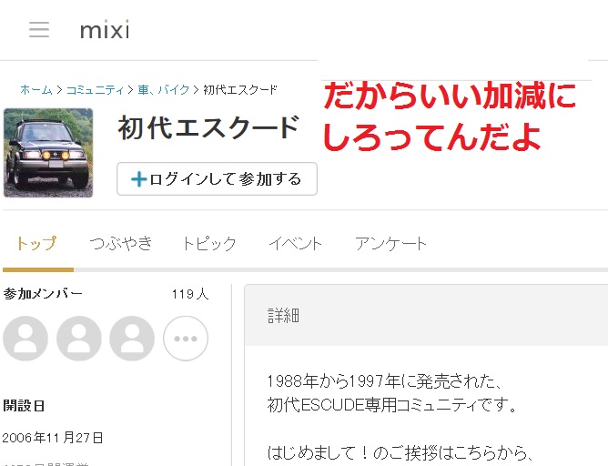 どうやら運営サイドは外来者からのメールを疑ってかかるスタイルのようで、何を言っても無駄らしい。初代に乗っている人だけかどうかは判りませんが、119人もの登録があっても、サムネイルなんかには無関心なのねと軽蔑するばかりです。