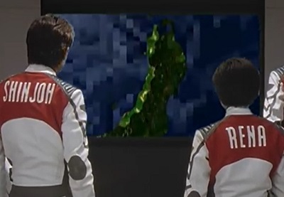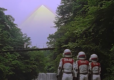そのためある程度近くまで調査範囲を絞り込めています。現地調査に赴いた面々は、しかしこれを上空からは発見できていないようで、地上探査で目視確認するに至ります。この頃、秋田県北部に怪獣が出現、北北東を目指して移動しているニュースが流れており、この怪獣はやがて光のピラミッドに到達しこれを破壊し始めます。ということは、ティガの遺跡は白神山地から十和田にかけてか、白神山地の青森県側の山岳地帯にあったと推測されるのですが、定かではありません。