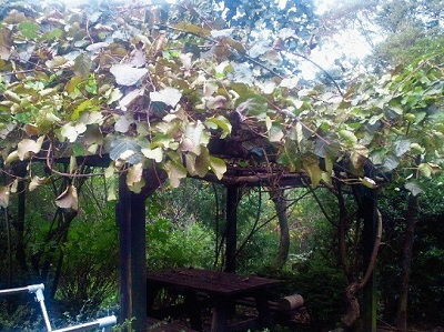 ハザードなんて言ったらキウイの方が気を悪くするでしょうけど、実際ほったらかしておいたら伸び放題になってました。隣の梅の木に襲いかかる勢い(というかすでに襲いかかってる)なので、冬まで待っていてはいかんと剪定しました。棚そのものももう寿命かもしれない。