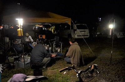 那珂川サイトから見える街路灯は水銀灯、そこかしこに設営されたキャンプはホワイトガソリンのランタンと電池式のLEDライトの時代ですが、月齢12ともなれば月明りも強まっています。ランプの灯も楽しいし、月が雲魔に隠れている間の闇夜もまた楽しいひとときです。夕方警戒された雷雨もなく、嫌になるほどの寒さにもならず、持ち寄った食材でお腹も満たされました。