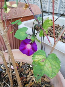 アサガオ、花咲いてます。葉もまだ青いしなぁ。