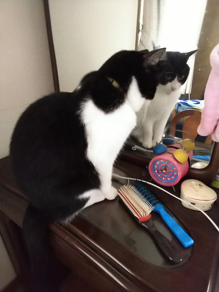 朝私が身支度してるとドレッサーに飛び乗って鏡の中をじーーーっと見てます。