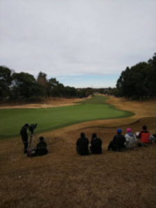 シニア組がコースアウトして木の根元(本当に地面から顔を出している根っこの横)に行ってしまったボールを打つトコや、女子組がカート道路の縁石に寄せてしまったボールを処理してるトコとか。