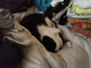 取り込んだ洗濯物を畳もうとしたら、ぽてぽてと寝室にやってきたいちに場所取られちゃいました。 畳んだ洗濯物で周りを囲んでも起きる気配なし。 この後、仕舞うのでよせ集めたり持ち上げたりしてもピクリとも動きませんでしたわ。 服が毛塗れになると、新月サンに怒られそう・・・