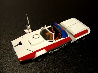 動力はジェットヘリ用ガスタービンエンジン。全長7300mm、全幅3408mm、全高1752mmものビッグサイズながら最高速度は320km/h。主要装備は小型ロケットランチャー、各種小火器、大型投光器、追尾装置、大型拡声器など。キャビンユニットとカーゴユニットはスライド分離し、ステップによる連結状態をとることが可能。このステップ部分には、起動時のブレーダー、スキャニーを載せることになります。