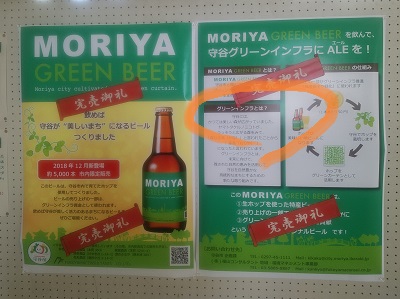 守谷市役所で見た張り紙に、環境政策であるグリーン・インフラで作ったオリジナルビールが完売という成果報告がありました。昨年、太陽光遮蔽のために窓辺に栽培したグリーンカーテンにホップを採用し、このホップからビールを作ったのだそうですが、これはなかなかの地域おこしですね。