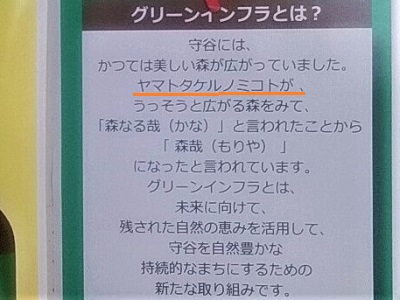 守谷の地名の由来は、あのヤマトタケルが「東征の折にうっそうと広がる森を見て『森なる哉(かな)』といわれたことから「森哉(もりや)」となった」という説明がなされていました。