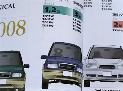 これはその昔、スズキがSSC出版に委託して発行した、エスクード誕生20周年記念誌の年表における、排気量というかエンジン世代での分類のようです。3型に相当するのはTA51W、TD31W後期型、TD51W、TD61W。年式による括りでは1996年式(10月期)からが3型となっています。この頃、1600シリーズは最終モデルの7型に移行し、2000ではV6が廃止されて直4にスイッチ。ディーゼルモデルは2型かなと思っていましたが、ここまでにマイナーチェンジを一度経験していたらしいです。