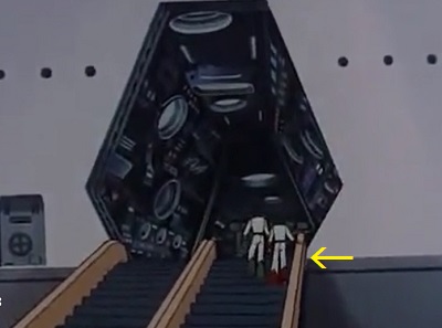 でも第一作目の第一話を見たとき、なんかすごいなーという直感を得ていたことも事実です。それがこのシーンで、火星から帰還し地球防衛軍司令部に赴く古代進と島大介が、エスカレーターを降りる直前、二、三歩ほど歩いてエスカレーターを階段のように移動していくのです。