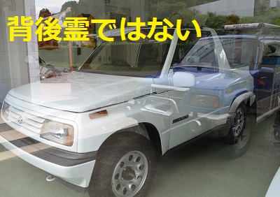 尾上会長が戻ってくるまで「雨降って来なけりゃいいなあ」と低めの雨雲を見上げながら、ガレージの中のコンバーチブルをガラス越しに撮ったら怖いことに(笑)
