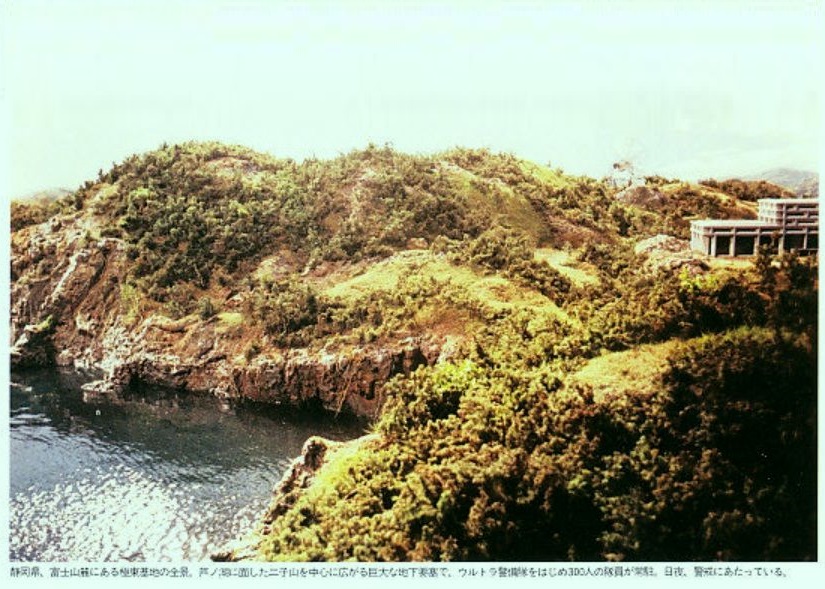 そのサードパーティーが一丸となって基地の所在を秘匿してきたひとつの事例が、上の図版のような「虚偽の解説」なのでしょう。しかし富士山麓の各都市や町は日常、侵略者の攻撃にさらされないのか?という疑問もあります。実際には極東基地なんて、何度も宇宙人に侵入されているので、秘匿性自体があてにならない話です。とはいえ大規模な空爆を受けた事例もあまりないので、ひょっとすると全地球防衛電磁バリア「プロジェクト・ブルー」の試作バリアシステムくらいは完成していたのかもしれません。富士山麓の上空(低高度)をこれで覆ってしまうと、逆にウルトラホークも飛ばすことができないので、フタゴヤマカタパルトは芦ノ湖の神奈川県側に設置されたのではないかと、最近は考えています。