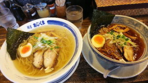 新月サンが白の醤油ラーメン。私は黒の醤油ラーメン。