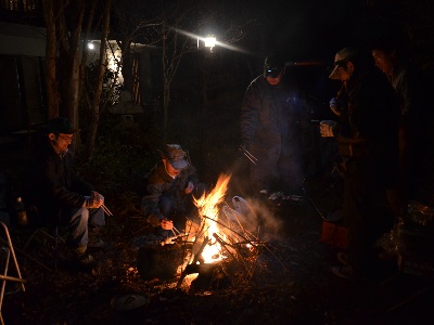この2つの行事が後に発展して、焚火と忘年会の流れが出来上がり、景気も悪くなったので(涙)宿泊先を借り受ける忘年会をとりやめ、焚火の宴会に忘年会が吸収されていきます。ちなみにこの写真に写っていないSIDEKICKさんに言及しておくと、この写真を撮っているため「居ない」ように見えますが、ちゃんといるのです。2週間あいているとはいえ、まさに週末関東人です。