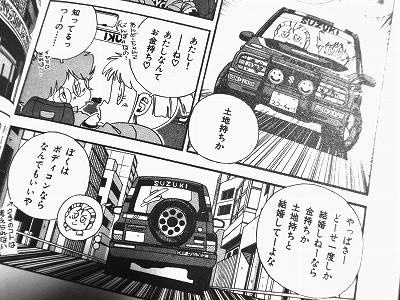 ま、残念ながら軽井沢~の時代にはスズキエスクードはまだ誕生していないので、耕平やその仲間たちがエスクードに乗って走るシーンは全巻隅々まで読んでも出てこないのですが、ブームの後半になると、たがみさんもしっかりこれを取り扱ってくれます。『NERVOUS BREAKDOWN』(なあばす ぶれいくだうん)の第7話に登場するTA01Wタイプのエスクードは、おそらく漫画作画として扱われた世界で最も古い事例です。