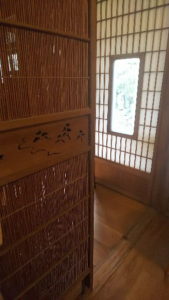 冬は硝子障子で仕切ってて、夏は風が通るように簾みたいな材で作られた障子(なのか?)に模様替えしてました。