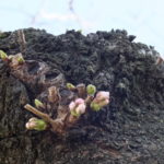 幹に張り付いてる方の蕾は、既にピンクの花弁が見えてるし。