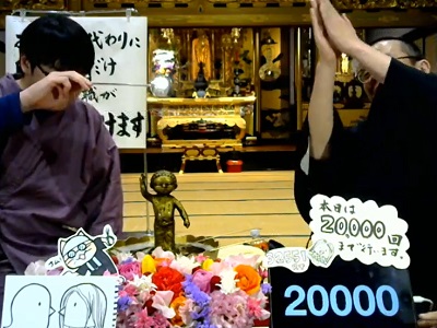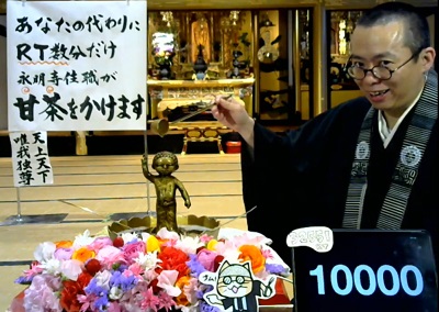 それにしても全国的に萎縮ムードの中、北九州の永明寺のご住職は「あなたの代わりにRT数分だけ永明寺住職が甘茶をかけます」とつぶやいたものだから、三万を超えるリツィートをいただくこととなり、十四時からずーっとライブ配信していらっしゃって、十八時四十分にようやく一万回に到達。恐れ入ります。これから一時は「ご飯無いわよ」と言われながらも、どうにか切り抜け、ご飯タイムでカレーライスののち、十九時十五分から再開だそうです。