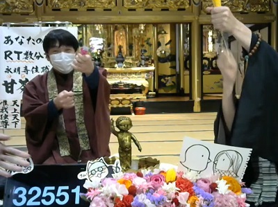 さて10年も大変なら1日も大変だった北九州の永明寺さん。昨夜20000回のお茶かけでいったんお休みに入り、本日午後から再開されましたが21時、リツィート数のお茶かけを完遂されました。