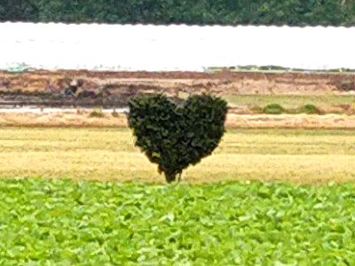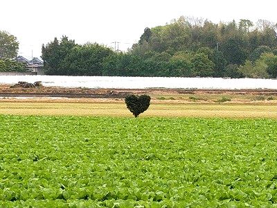 引き伸ばしてみます。なるほどこの畑の所有者が何か思うところあっての、刈り込みのなせる業。ちょっと遠くて何の木かまではわかりませんが、引き返してみただけのほっこり感は得られました。