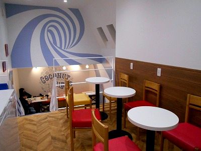 このお店を内装設計した知人によれば、「狭い店内をどうやって広く見せようか」という課題に取り組んだそうです。店内はまっさらの状態で出来上がっていて、ココナッツグレンのテーマカラーや企業イメージとしてフォーマットされているデザインを、彼なりのアイデアでしつらえていったのですが、設計受注から内装完成まで一か月しかなかったというすさまじい仕事。でも、いわさきさんのリポートを拝見する限り、好印象を醸し出しているようです。