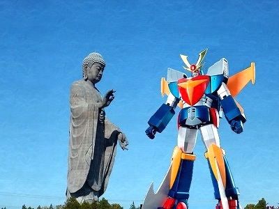 牛久の大仏さんは、実際には高さ100mですが、台座を加えるとダイターン3と同じ120mの姿でそびえております。