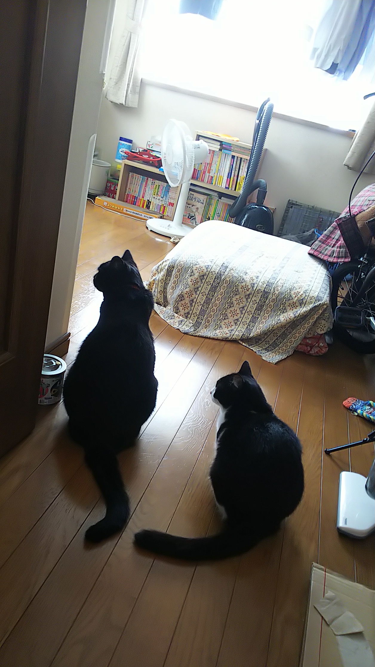 姫ちゃんずはご飯前後の開放タイム以外ケージの中なので、 部屋のドアは開けっ放し。 開いてるのでチビずは出入り自由なんですが・・・ 今まで通りにはいかないわねぇ。 奥に見えてるのは使っていない布団にカバーかけただけの なんちゃってソファーなんですけど。 でんがよくここで昼寝してたのよね。 今は〝知らないヘンなの〟がいるから寝れませんって感じ。