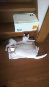 やっと暑くなったので〝なんちゃって冷風機〟出動。 ま、でんいちはあんまりここ来ないけど。 未だに亡き婆にゃの縄張りなんだろうか??などと思ってたら 来ましたよ姫ちゃんず。 生まれて初めての夏だもんねぇ・・・ 熱中症にさせないように気を付けないとなー
