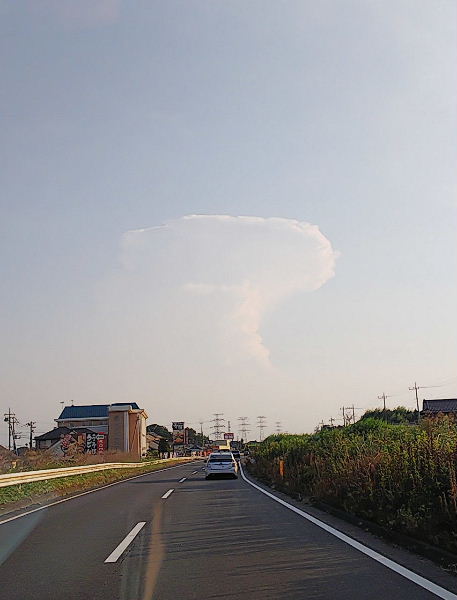 お盆休みの最終日。 「餃子が食いたい」と言う新月サンに連れられて 古河の道の駅まで買い物に行った帰り。 4号線を南下してたら目の前に大きな雲の塊。 茸?(いや、ホントに巨大な椎茸・・・) これがずっと形も崩れずビシっと立ってるって・・・ あとで雨雲レーダー見てみたら立川辺りが凄い事になってました。 (こっちは一滴も降らず仕舞い)
