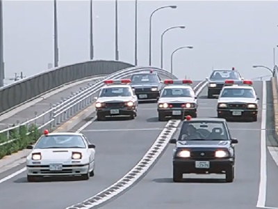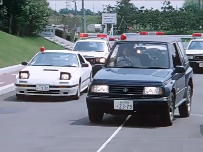 これだけ切り取ったら「なんだこりゃ」なシーンですが、西部警察ほどの数ではないにせよ並み居るパトカーを従えて、僚機にFC携えて、エスクードのコンバーチブルが先頭を切って駆けつけるなんて、想像したこともありません。あーこれはこのあと攻撃されて全車木っ端微塵にされちゃうフラグ・・・かと心配もしましたが、とりあえずそういう展開にもなりません。89年7月に上映された、東映まんがまつりのプログラムに組まれていた「機動刑事ジバン」の場面です。