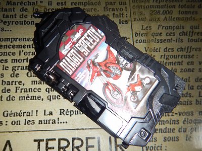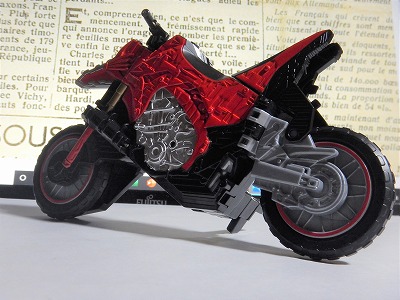 そのうえ「ディアゴスピーディー」とか「毎号特別加速」とか「タイヤを開け、深紅のボディが目を覚ます」とか、もう書籍の分際でしゃべりまくる、いちいちうるさい音声ギミック。前作のライズホッパーはスマートフォンからバイクへの変形なので、しゃべくることには違和感はなかったですが、まあこっちもうるさくてかっこ悪かった。だけどここ数作で断続的に続く、この手の小型ツールがでっかくなってバイクになるというアイテムは、アイデアを使いまわしすぎ。