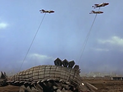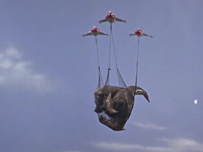 それはジョンスン島から古代怪獣ゴモラを日本へ輸送したときのことで、3機運用により重量2万tものゴモラを吊り下げ飛行できたことです。ボーイング747-8F(全長 76.3m、全幅 68.5m、巡航速度 マッハ 0.85)の最大積載量が133t、世界最大級の輸送機といわれるAn-225の貨物搭載能力でもペイロードは公称250 tなのです。2万tもの質量を空輸するフォーメーション維持自体、「さすが科特隊!」と評価すべき部分。ただし覚醒したゴモラの危険性からパージする結果となりました。