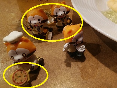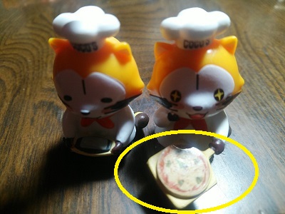 というわけで、まずは二度にわたってトライしたところ、運よく異なる二種類を引き当てました。左は包み焼ハンバーグを持ち、右はピザを持っていますが、袋から取り出す際に同じデザインのコック帽が見えた瞬間はちょっとビビらされましたよ。まあ序盤戦は確率的にもそういう流れで幸先良いスタートです。が、当然、笑いを盗らねばならない羅須軽党ですから、盗りたくなくともこの流れはどこかで止められること請け合いで、マーキングに注意。