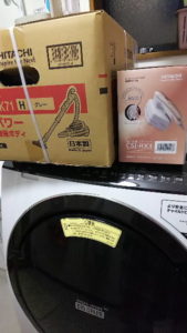 あれやらこれやら展示品を覗きこんでたら 「ドラム式ご検討ですか?」と にじり寄ってきた販売員さんがHITACHIの人でした。 予算的にドラム式は厳しいって言って縦型見てみたら 昨日の〝踏台〟の話に(笑) で、「お勧めはこちらですねぇ」と言われたのは 型落ちのドラム式。でも最上位機種。 元値なんと40万・・・(値引されて結構安くなってた) まぁ結局、玄関から洗面所に至る間がその機種だとギリギリだったので 最新型買う事にしたんですが。 (型落ちの方よりは幅に余裕があったのよ。¥高くなっちゃったけど) 「今、家電3点お買い上げいただくと10%OFFになるんです。何か他には・・・」 は?どゆこと?? まあそういうキャンペーン中で、2点他に買っても支払総額は下がるという 何だか騙されたんだか得したんだか判らないうちに、掃除機とアイロンも 買う事に。 アイロン壊れてたし、掃除機も大分くたびれてたからねぇ。 良かったっちゃ良かったけど・・・