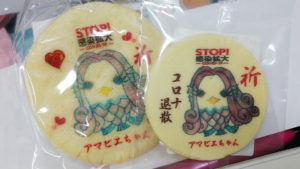 会社のお菓子箱に突っ込まれてたアマビエ。 知らぬ間に誰かが貰ってきたみたい。 ホントにねぇ・・・ 早う下火になってほしいわ。 ちなみにお味は普通の塩せんべいとクッキーでした。