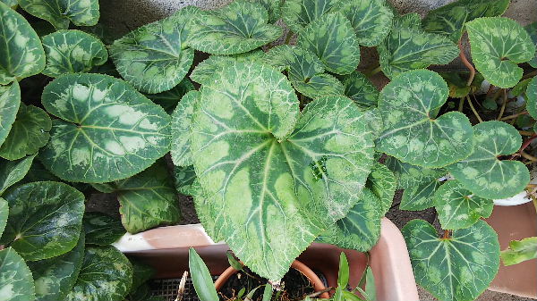 シクラメンに水遣りー・・・ん? 真ん中の葉が他のよりも 2倍くらい大きいのは何故??? そして10月に花咲かせた鉢以外は まだ一個も咲かず(笑) ちっちゃい蕾がいっぱい出来てきたから そのうち咲くとは思うンだけど・・・