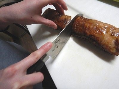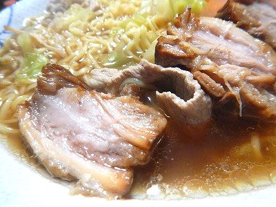 鍋とコンロは既に娘らが煮込みラーメン(煮込みラーメンなのかよー)の準備を始めているので、こちらはラップにくるんで電子レンジで温めます。加温時間は5から6分。3分もすると、あのこおばしい香りが漂います。香りの感じからするとけっこう濃い口です。ここから「あ・・・」という事態に気が付くのですが、仕上がったブロックがとても柔らかく、坂内の喜多方ラーメンについてくるような薄切りはまず不可能(笑)