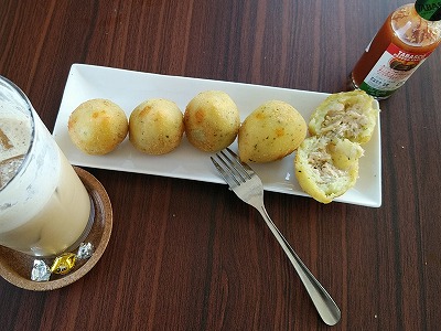 ブラジル風コロッケはどうやらポルトガル語を語源とした名前のようです。この形状が鶏の腿肉に似ているってことで、 ポルトガル語の「コシャ」(coxa 腿)で、COXINHA(コシャーニャ)。コロッケ自体、茹でたジャガイモやキャッサバを潰したものの中味にほぐした鶏肉を入れて揚げています。昨年来、時々通っている「CUP OF JOE」の定番メニューで、その都度食べたい数だけ注文できます。5個頼むと1個分がサービスになっているのを最近知りました。