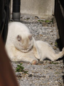 家の横と言うか裏と言うか・・・の、犬走り。 今の時期はホンの僅かな時間だけ奥まで日が差すので こんな光景が。 でん助くらいあるかなぁ、体重。 綺麗な水色の瞳の白猫さんであります。 ・・・どうみてもベージュだが(笑)