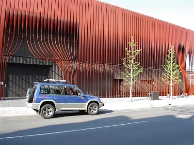 またしても合成てすが、このルーバーのような赤い壁もまた、青森市と思われます。青森港に対してベイブリッジの内側にある「青森市文化観光ねぶたの家ワ・ラッセ」の外壁ではないかと。実際には歩道なので乗り入れられませんが、暖簾をくぐるようなイメージのこの壁は金属です。ここで写真撮りたくなるんですよ。