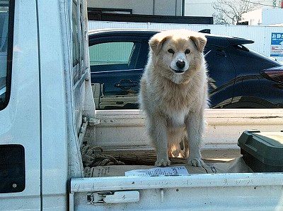 移動先がいくつにもわたってちょっと忙しく、コンビニの駐車場で手短に昼飯を食っていると、それまで隣の軽トラの荷台の後ろの方に寝そべっていたこいつがこちらの窓近くまでやってきてじーっとアピールするんですが・・・