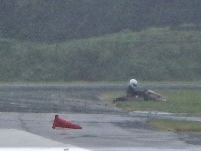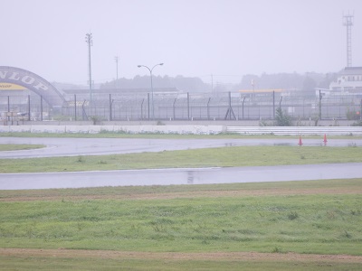 感慨深いですよ。かつて川添哲朗君が千葉まで来てくれたことがあり、それに続いて遂にチヒロ君が利根川を越えてきた(なんのこっちゃ)。しかも台風まで呼び込んじゃう破天荒ぶり。小雨によって昨日までの猛暑は何処へ行った? と思わせるほどの涼しさ。加えて練習走行時にはレインタイヤを履いていたのに、「合羽を売り切ったら空が明るくなり一時的に雨も止んだ」と、オフィシャルサイドが全車スリックに換えてしまい、第一ヒートは再び降り出した雨の中のスタート。