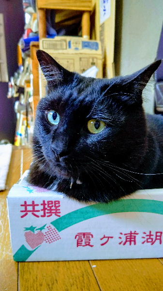 光の加減で〝オッドアイ〟に写ったでん助。 そう言えば身近な猫でオッドアイは一匹も居ないなぁ。 それにしても。 次から次へと空き箱を渡り歩くのは止めて下さらんか。 (その前に片付けろや)