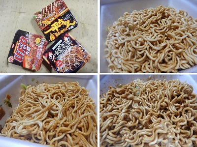 昼飯時よりちょっと早く、「一平ちゃん」(写真右上)を作りました。若干細めの麺と、入江さんが言うように「マヨネーズ入れると一平ちゃんが勝っちゃう」のは本当の話で、僕にはこちらの方が好みです。マヨネーズを和えたらかえってしつこくなるんじゃないかと思っていたのですが、ソースの味が和らげられることや、辛子風味がこざっぱりしていて、5‐0判定で「U.F.О」を打ち倒しましたよ。
