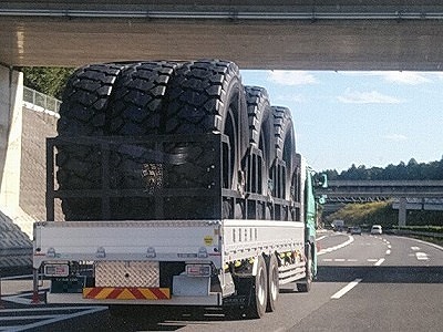 サイズから見てコマツの930Eとか980Eに履かせるタイヤでしょうか。その昔、東日本大震災復興現場で、タイヤ履いてる(まあ当たり前だけど)重ダンプを見ていたときは、ダンプ自体の巨大さに圧倒されてしまいましたが、タイヤだけの状態だと、あらためて呆れるほどでかさを感じます。このタイヤだけで、一本あたり5トン近くあるそうですから、運んでいるトラックにかかる積載荷重の方を心配しちゃいます。