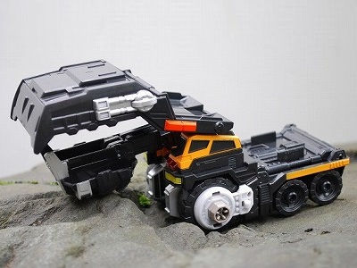 これを見て思い浮かべるのは、まあ知識の範囲が馬鹿ですから「轟轟戦隊」のゴーゴーダンプなんですよ。積載用バケットが2連になっていて、これが巨大ロボ・ダイボウケンの脚部として割れて、あとの部分は胴体を担うという、複雑変形メカニックです。が、こいつってば全長30mもあって、980Eなどの2倍。ダイボウケンの右腕になるゴーゴードーザー(13.9m)あたりが980Eよりちょっと小さいくらい。でもドーザーはキャタピラなので除外です。