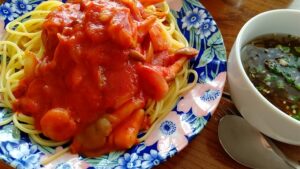 先日のお休み。 ここしばらくちょこちょこ出掛けていたので 久しぶりに昼ご飯作って、家で食べましたよ。 冷凍庫から発掘(!)した ミイラ化したシーフードミックス・・・ コチコチに固まってたけど、トマトソースで 炒めてる間に何とか戻りましたわ~ トマト味強めだったけど、それはそれで美味。