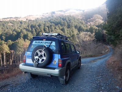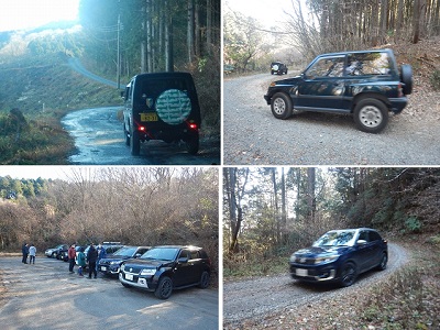 こんな呑気なこと言っているから、朝から痛い目に遭うのですがその話は後回しとして、今回の林道に入ったのはエスクード7台とジムニー1台。ちょっと隊列で走るのは近所迷惑な数なので、例によって2分程度のインターバルで1台ずつ距離を取って走り、要所要所で合流、さらにインターバルスタートを行います。要所の位置は各位のカーナビに記憶してもらいましたが、ルート案内がこちらのコース設定どおりにならなかったらしく、何台かは迂回路で大回りさせられたようです。